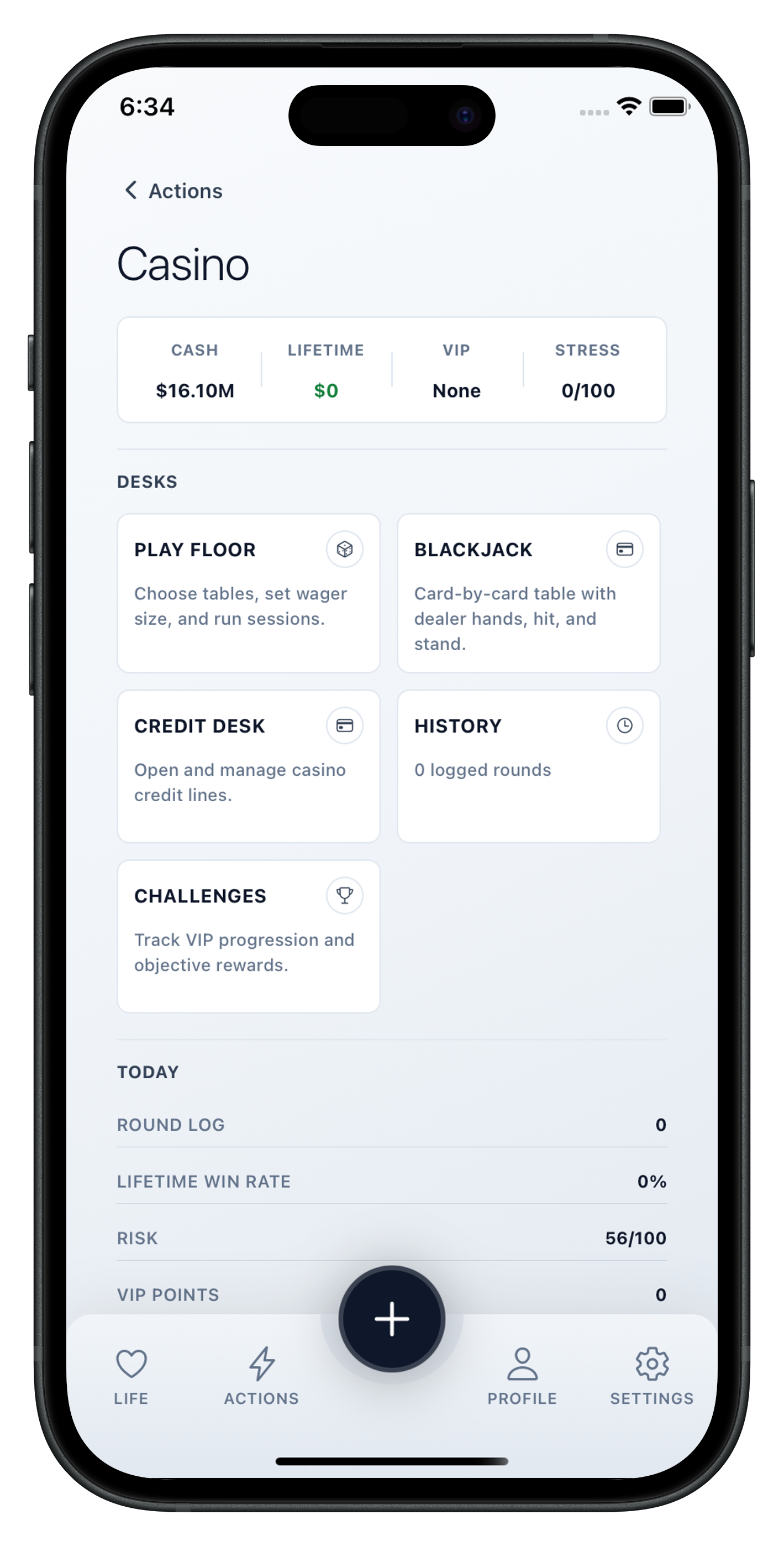 Hit the tables with blackjack and test your luck against the house. Earn VIP status, unlock credit lines, and complete challenges for bonus rewards. But be careful—debt, interest, and missed payments have real consequences. Can you walk away a winner or will the house always win?
