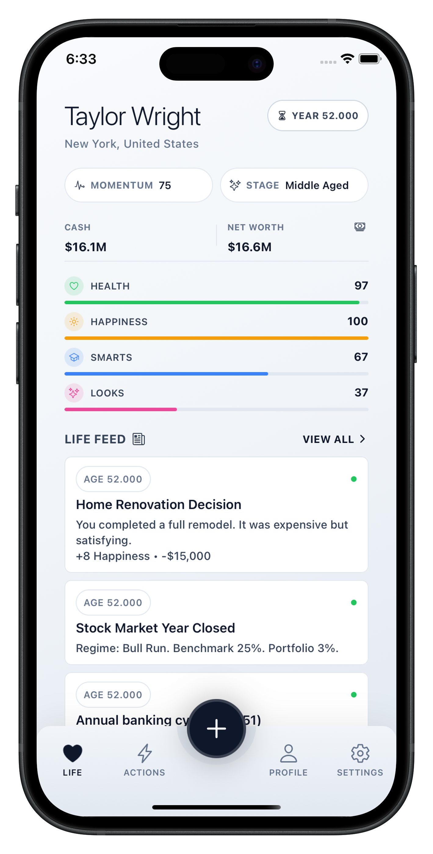 Every choice you make is recorded in your life story. Watch your character grow from birth through major milestones—graduations, promotions, marriages, and everything in between. Each year brings new events that shape who you become. Your life log is the narrative of a lifetime.